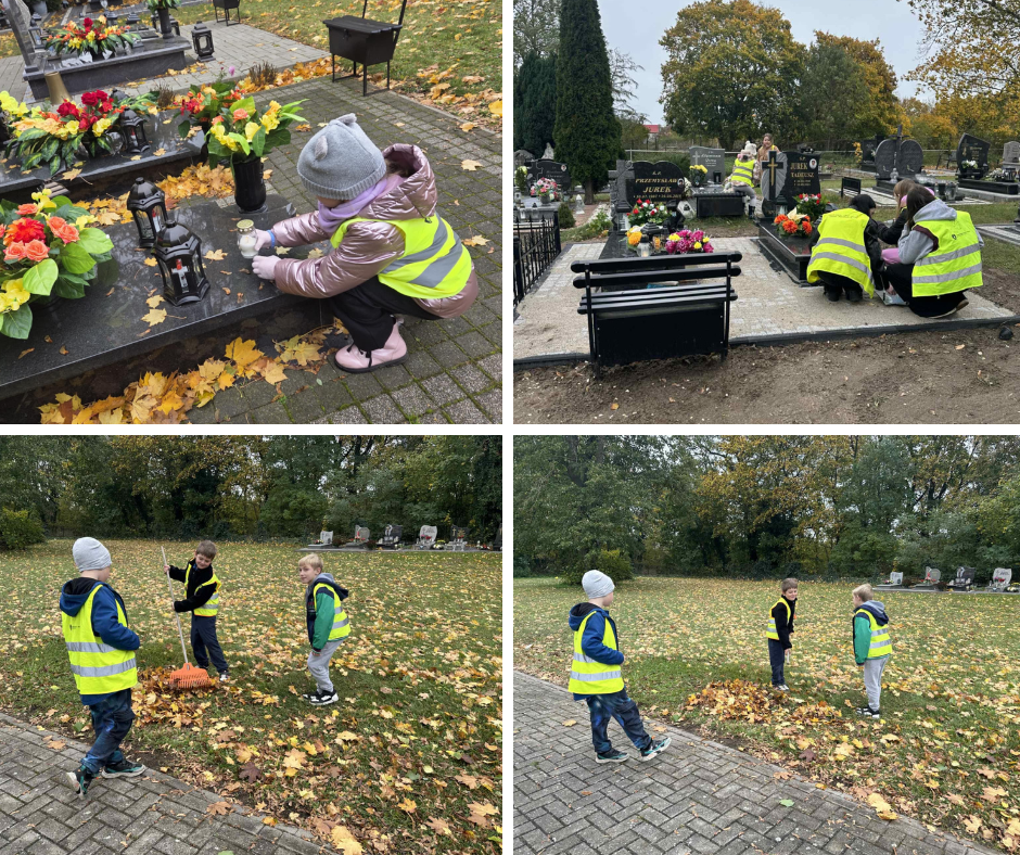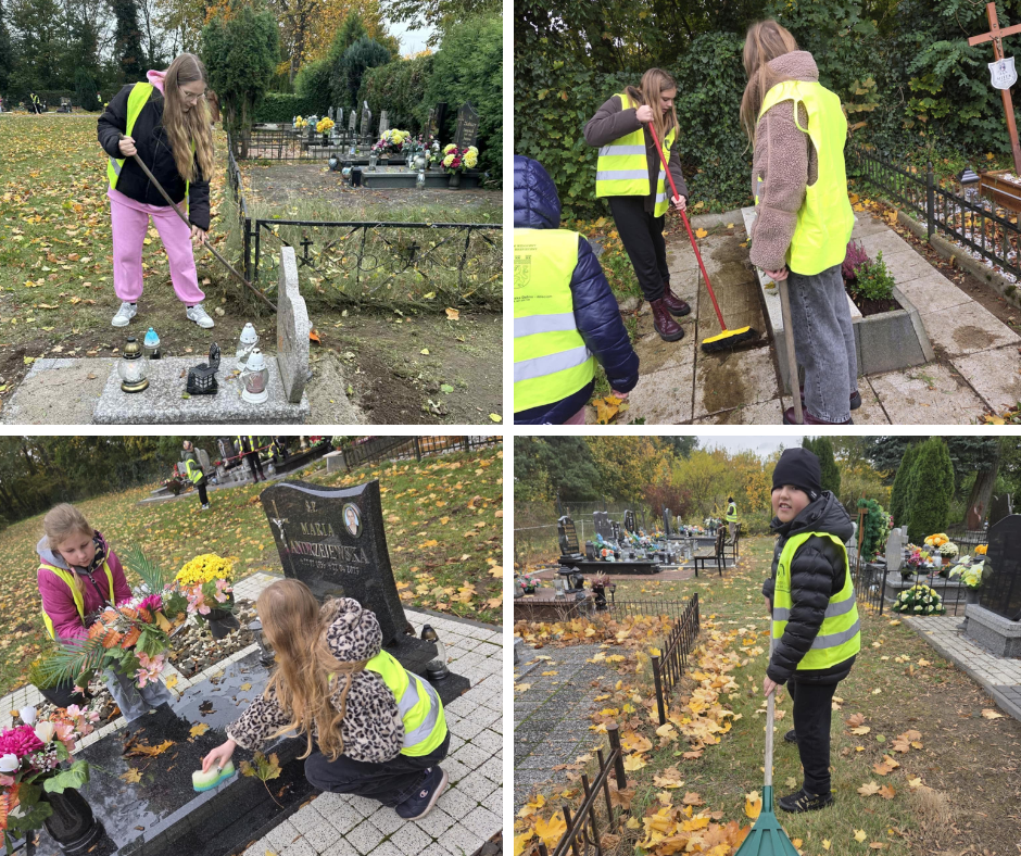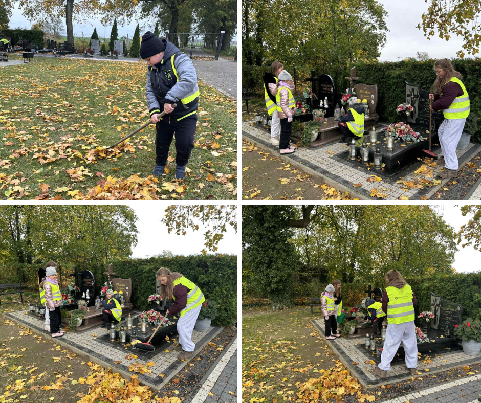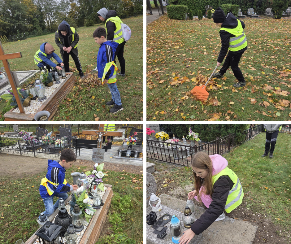 28 października uczniowie w kilkuosobowych grupach uporządkowali groby – zebrali zbite znicze, wynieśli zwiędnięte kwiaty i zgrabili liście.